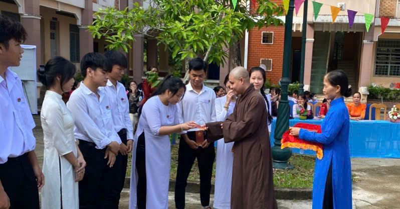 Đại đức Thích Tánh Mẫn (Người sáng lập và điều hành Quỹ Thiện Nguyện Vườn Sala) đại diện quỹ Thiện Nguyện trao quà đến các em học sinh