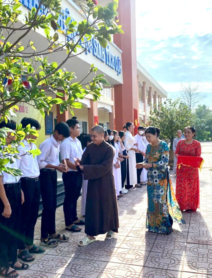 Đại đức Thích Tánh Mẫn (Người sáng lập và điều hành Quỹ Thiện Nguyện Vườn Sala) đại diện quỹ Thiện Nguyện trao quà đến các em học sinh.